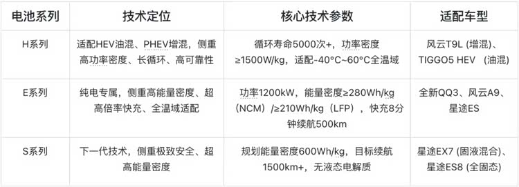 奇瑞犀牛电池:H/E/S三大系列,覆盖混动、纯电、固态,2026年Q4固液混合上车,2027年全固态装车验证,路线激进,侧重前瞻布局。