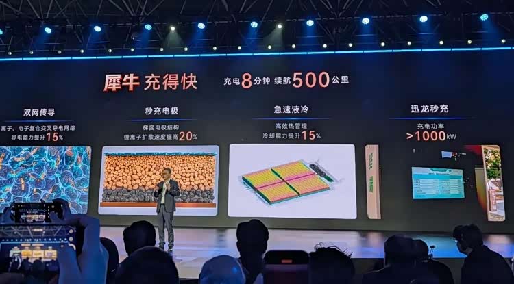 奇瑞犀牛电池:峰值充电功率1200kW,官方实测8分钟充电可补充500公里续航,高效补能区间10%-80%,适配800V高压平台,充电倍率可达3C以上。