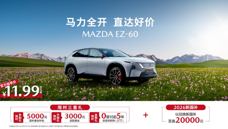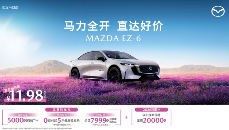 2026年车市政策红利集中释放,新能源车报废更新最高可享20000元国家补贴。长安马自达在此基础上主动加码让利,EZ-60与EZ-6双车推出多重专属购车礼遇,补贴力度全面超越同级竞品,更保留马自达标志性的人马一体驾控与全球五星安全品质,真正实现智能体验、驾控乐趣与购车实惠三者兼得,成为当下购车的更优选。