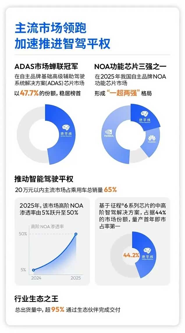更值得关注的是两个数字:中高阶智驾芯片出货180万套,翻了近5倍;20万元以内主流市场,量产第一年就拿下了44%的份额。这意味着地平线不仅卖出了更多的芯片,更卡住了智驾普及最核心的位置。