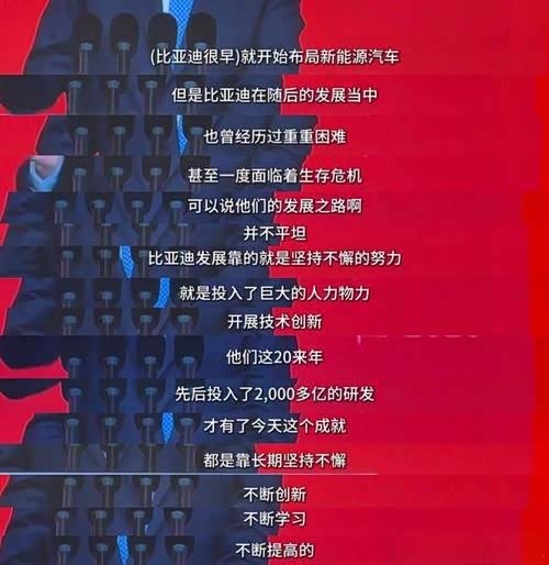 “比亚迪的发展靠的就是坚持不懈的努力,就是投入巨大的人力,开展技术创新... ...他们这二十来年,先后投入了2000多亿的研发,才有了今天这个成就,都是靠长期坚持不懈,不断创新,不断学习,不断提高。”