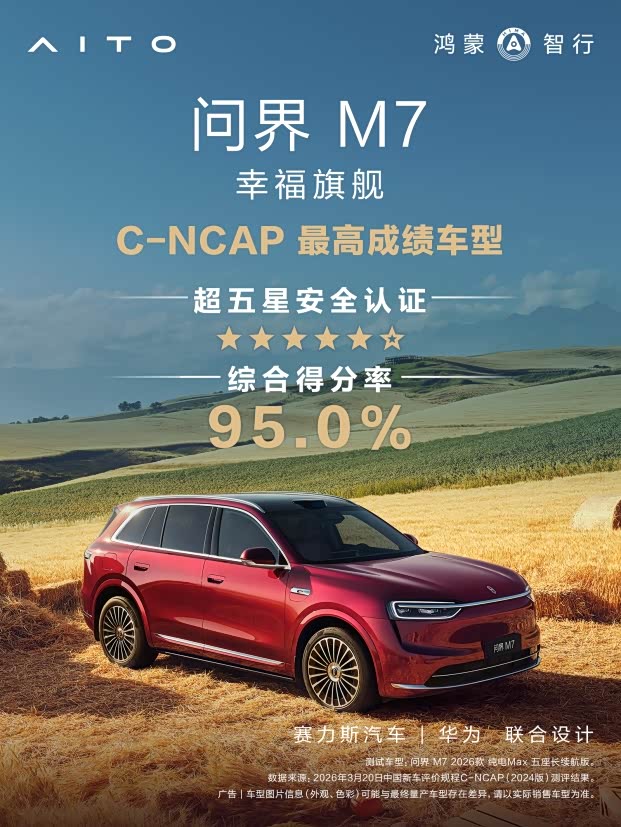 将目光投向问界M7本身,其魅力指数背后的产品力支撑堪称硬核。3030mm的超长轴距,赋予了座舱“奢侈”级的宽适感。大五座与享六座的灵活布局,让从三口之家到三代同堂的出行需求都能找到最佳答案,再搭配上舒适度极高的零重力座椅和超大后备箱,每一次家庭出游都变成一种享受。而在安全领域,问界M7更是不遗余力,前不久以95%的综合得分率刷新了C-NCAP(2024版)的历史最高分,荣获超五星安全认证。这份安全底气,源自其八横五纵的超硬核车身结构、9个安全气囊的被动守护,以及华为乾崑智驾ADS 4辅助驾驶系统带来的主动避险能力,构建起一道全方位的安全屏障。