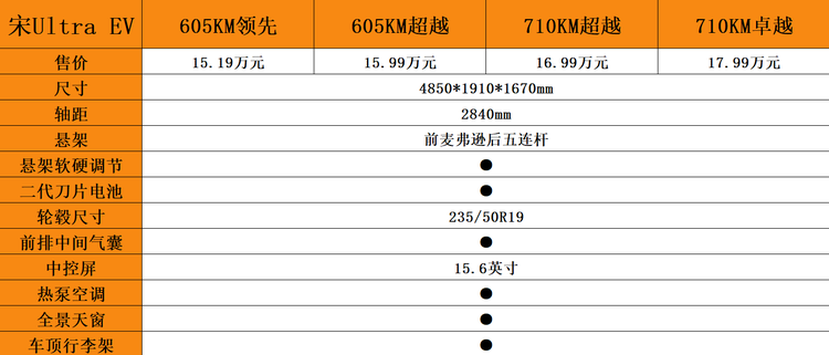 作为比亚迪旗下又一款全新车型, 宋Ultra EV(参数|询价)在今天迎来了正式上市,新车给出的官方指导价格为15.19-17.99万元,起售价比此前公布的预售价格有所降低。宋Ultra EV将会是继方程豹钛3之后又一款15万级搭载第二代刀片电池的车型,因此这款车在上市之前也受到了不少消费者的关注。那么,接下来一起来看看新车各款配置之间应该如何选择。