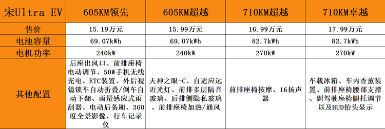 总体来看,宋Ultra EV虽然提供了四个配置,但却也能让客户有一个清晰的购买选择。对于预算不足的消费者而言,入门版本给到了实用的配置,并非鸡肋;两款中配车型虽然售价提升,但也能让消费者感受到钱花的“物有所值”;而针对预算充足的客户,顶配版本还增加了冰箱、香薰、腿托第增加情绪价值的配置。
