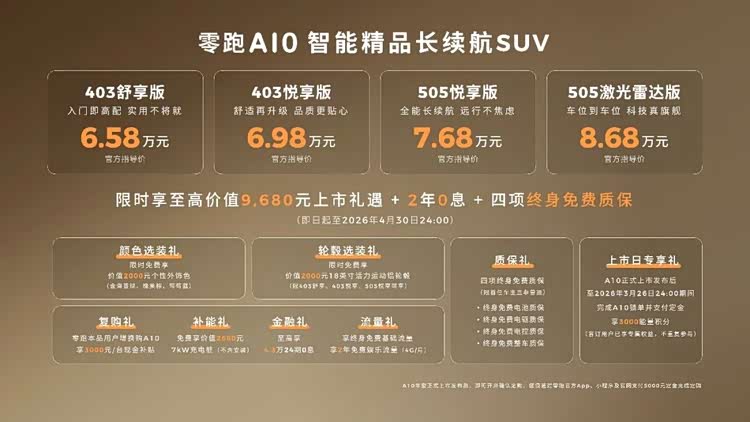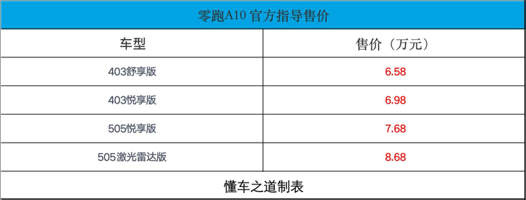 【懂车之道 产品】近日,懂车之道获悉,3月26日, 零跑A10(参数|询价)正式发布上市,共推出4款车型,官方售价区间为6.58-8.68万元。新车定位为纯电动小型SUV,将配备激光雷达、高通8295芯片+8650芯片、最长纯电续航可达505km。下面,和大家一起来详细看看新车的产品力如何?