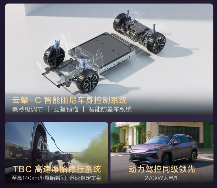 在全面配置上,宋Ultra EV做到了“三大越级+3C护体”。 710km续航、270kW电机(6.8秒破百)、2840mm轴距(后排腿部空间986mm)构成了三大越级;云辇-C智能阻尼车身控制系统、TBC高速爆胎稳行系统(140km/h爆胎稳行)、天神之眼辅助驾驶系统构成了3C护体。这套组合让宋Ultra EV在产品力上没有明显短板。