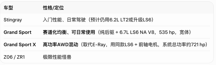 2027款科尔维特产品线将有清晰的分层,而Grand Sport正是其中最关键的一环: