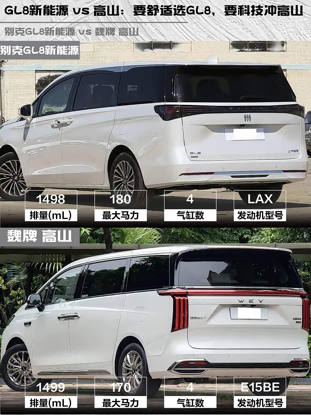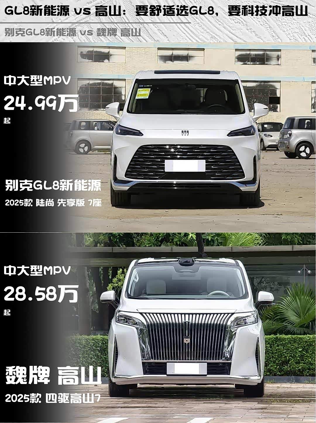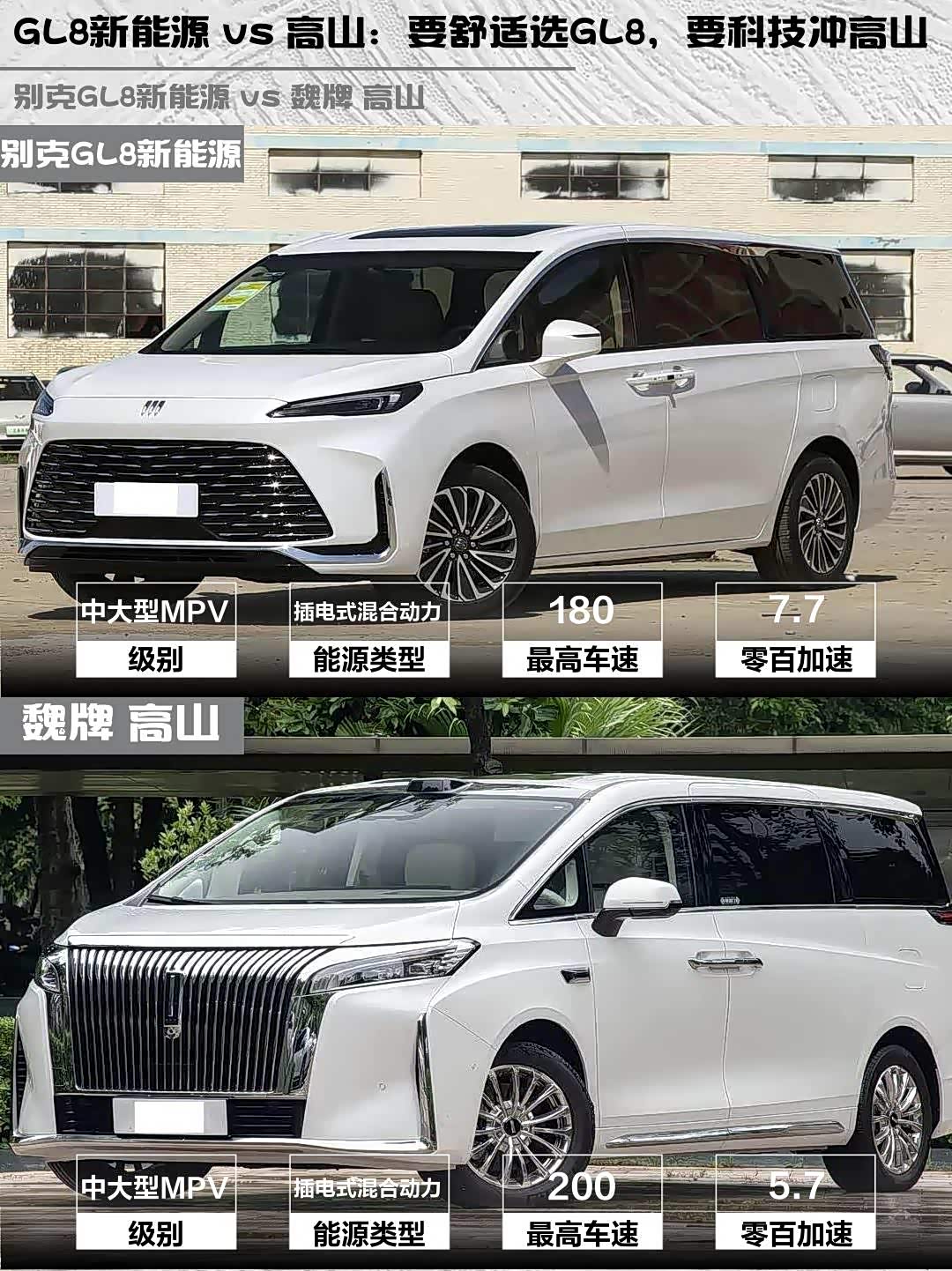 别克GL8新能源(参数|询价) 2025款 陆尚 先享版 7座 vs 魏牌 高山 2025款 四驱高山7,两台插混MPV正面刚!谁才是家用商务全能手?🤔