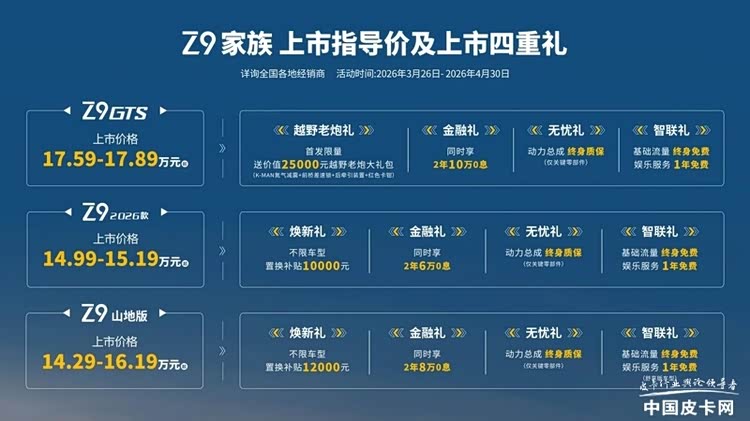 2026款Z9售价14.99-15.19万元,外观采用此Z9 GT设计,其核心动力沿用日产雷诺M9T发动机+采埃孚8AT变速箱,配备分时四驱系统,基于“星核”越野平台打造。本次改款主要提升智能、舒适与外观配置,维持原有定价区间。