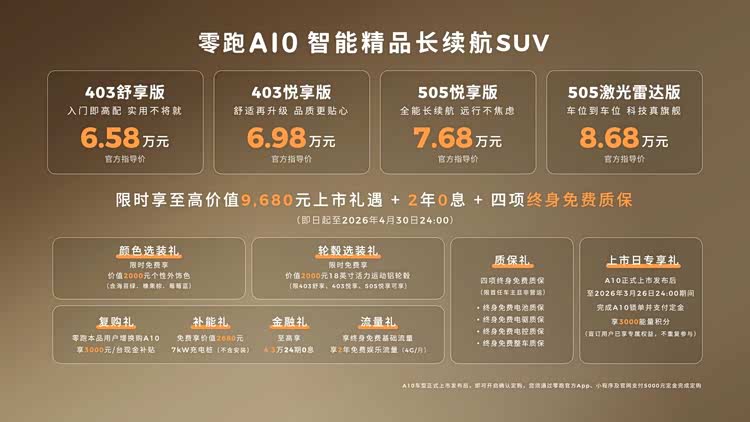 此次零跑A10共推出403km、505km两种续航版本共四款车型,其中搭载激光雷达+车位到车位领航辅助驾驶的505激光雷达版仅8.68万元,成为10万内唯一配备该高阶配置的纯电SUV。为回馈用户,零跑还推出限时上市权益,截至2026年4月30日,用户可享选装、复购、补能、金融等多重好礼,综合权益价值高达9680元,还可享受2年0息金融政策与四项终身免费质保,让用户以更低成本享受到高阶配置与品质。