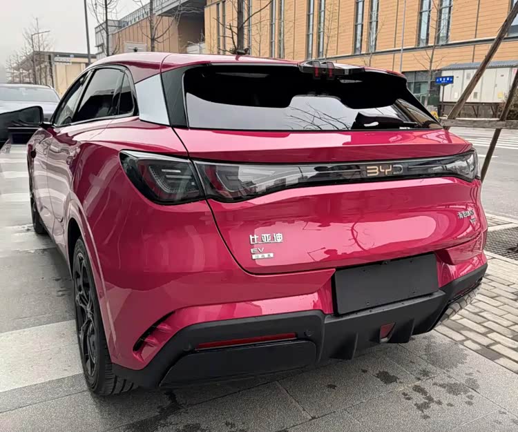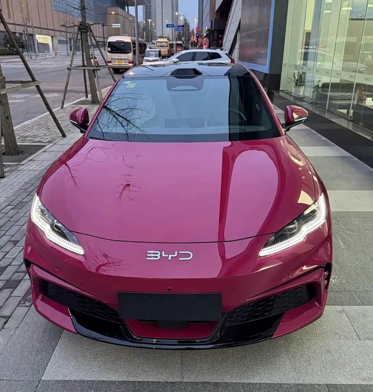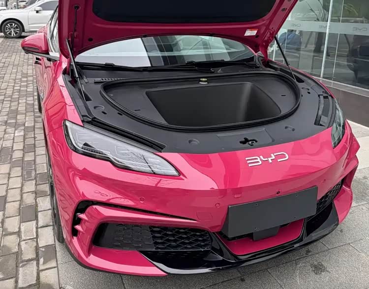 车身侧面采用动感两厢轿跑造型,线条流畅凌厉,悬浮式车顶搭配隐藏式门把手,勾勒出灵动的车身姿态,配备19英寸熏黑花瓣式轮毂与红色刹车卡钳,进一步凸显性能属性。车尾配备大尺寸不规则尾翼与熏黑扩散器,贯穿式“光环涟漪”尾灯内置发光品牌LOGO,尾部还标注“闪充”与红色“天神之眼”尾标,彰显其专属身份。值得一提的是,新车新增了“波西亚玫红”车漆,配色鲜活吸睛,与小米SU7“璀璨洋红”风格相近,看上去逼格更高。