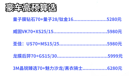 l 豪车高预算之选:预算5000元以上,优先选择“量子膜、威固、3M”的高端系列,核心看“技术工艺(如磁控溅射)、品牌调性、个性化服务”,追求“性能+品牌”的双重满足。