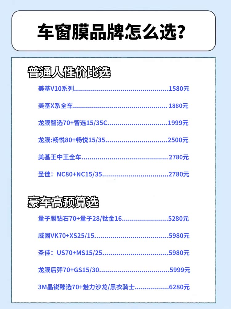 l 普通人性价比之选:预算1500-3000元,优先选择“美基、龙膜、圣佳”的入门款或经典款,核心看“隔热率、质保期、品牌售后”,避免为“品牌溢价”买单。