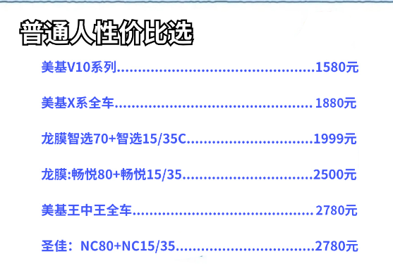 l 选择理由:1880元的价格与龙膜智选系列接近,但美基的“全车定制”更灵活,可根据车型尺寸精准裁剪,避免浪费;适合对隔热要求较高、追求“一步到位”的车主,尤其是经常在南方高温地区行驶的用户。
