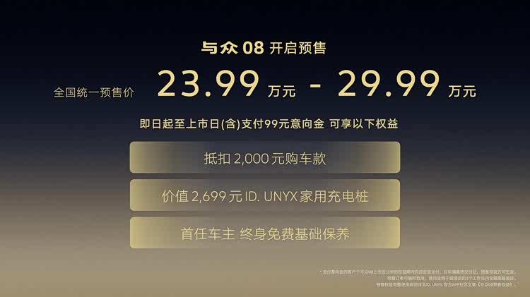 与众08定位于中大型纯电SUV市场,预售价格区间为23.99万元至29.99万元。金标大众宣布,即日起用户支付99元意向金,即可享99元意向金直接抵扣2000元购车款;首任车主终身免费基础保养;赠送价值2,699元ID.UNYX家用充电桩。
