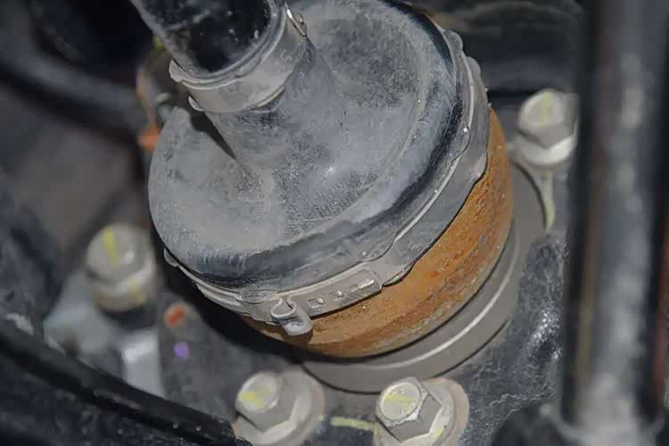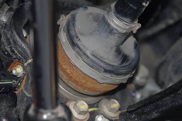 这辆车的后驱动轴球笼罩,出现了非常明显的生锈现象。