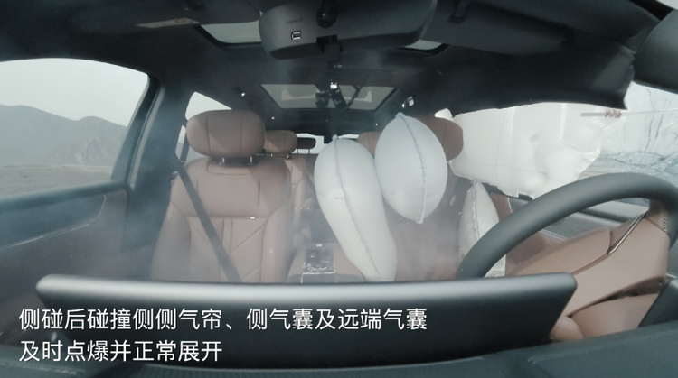 在车辆遭受撞击以及在高坡翻滚过程中,我们可以看到对应的气囊都能够及时点爆并且正常展开。值得关注的一点是华境S从A柱延伸至D柱,2.6米的超长侧气帘。要知道,大部分大六座SUV车型气囊配置主要覆盖前排和二排,第三排乘客在碰撞中能获得什么保护,考验的是车企是否舍得用料,是否将车上每一个座位,都纳入了同等水平的安全考量。