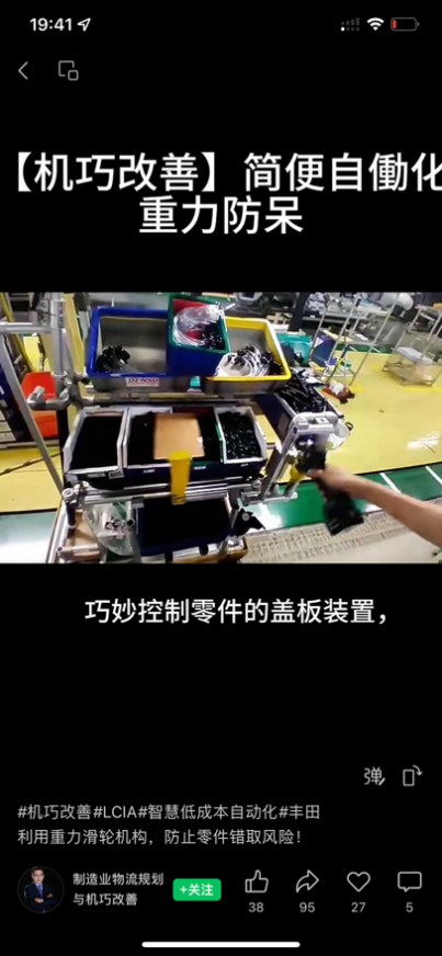 这里再单讲一下生产线上的机巧改善,比如零配件拿取如何防止误操作,如何更省力,如何减少操作步骤等等,这类视频现在也越来越多。本质上是减轻工人的负担,提升操作的正确率。