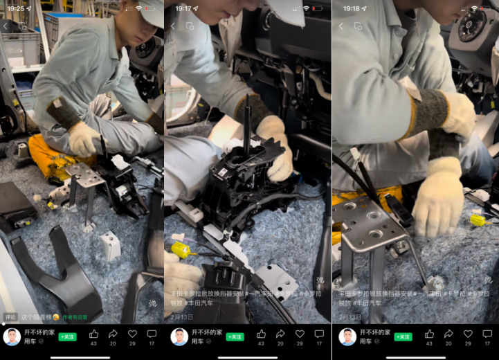 换挡器及相关的线束安装,是工人坐在车内,用电动工具拧紧相关螺栓,并布置相关线路。看着工人坐在一个小垫子上,侧拧着身子操作,屏幕外都感觉有些腰酸背痛。