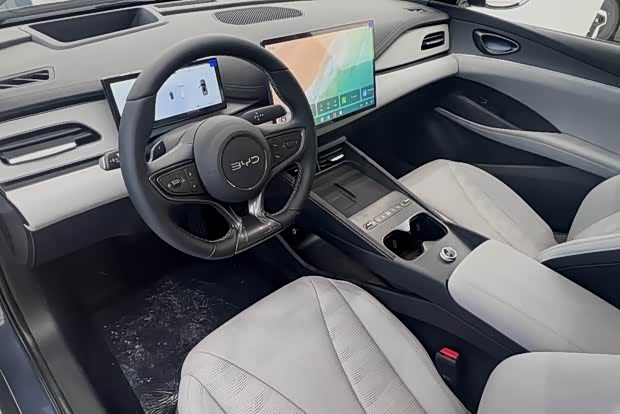 座舱整体与现款车型保持一致,但部分细节进行了优化和升级,比方说换挡杆,新款海豹06GT采用了怀档,因此前排中央通道的位置也有所改动,储物空间更多也更大了。中控屏升级为智能座舱高阶版-DiLink 150