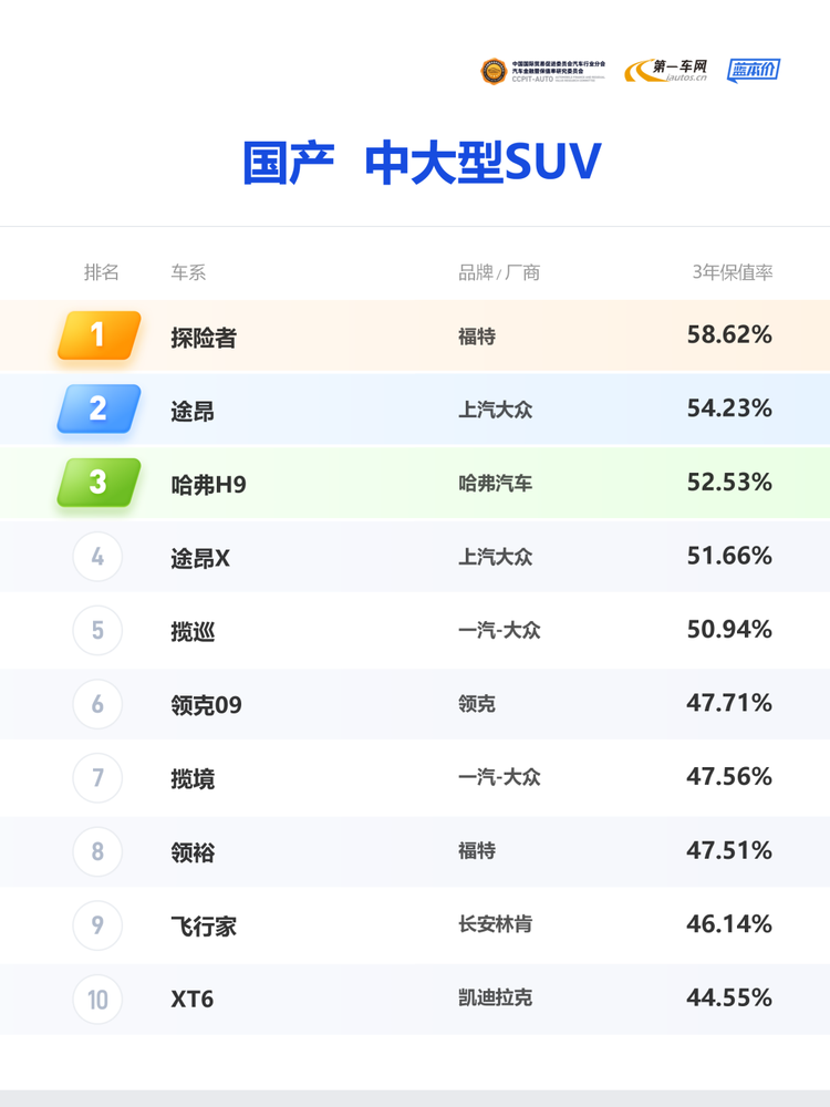 2026年3月,中国国际贸易促进委员会汽车行业分会汽车金融暨保值率研究委员会&第一车网蓝本价正式发布2026年2月保值率排行榜。国产中大型SUV凭借大气的空间布局、强劲的动力表现与多功能属性,成为家庭出行、越野爱好者的热门选择。新车端,合资与自主品牌持续在中大型SUV赛道深耕,从豪华配置、越野性能到智能科技不断迭代;二手车端,这类车型的长期持有价值备受关注,保值率早已从购车的附加参考项,升级为衡量车型品质、品牌口碑与市场认可度的核心硬通货。在本次国产中大型SUV保值率榜单中,探险者、途昂、 哈弗H9(参数|询价)、途昂X、揽巡等车型跻身前五,它们以差异化的产品优势站稳细分市场,而保值率的排名,正是市场与消费者对车型长期价值的最直观投票。