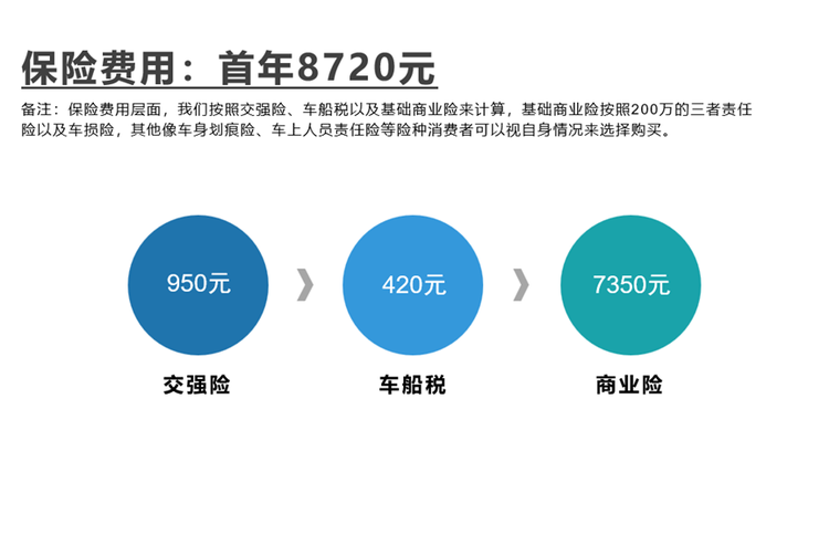保险费用层面,我们主要计算交强险、车船税以及基础商业险这几个险种,其中基础商业险包含200万的三者责任险及车损险,至于车身划痕险、车上人员责任险等额外险种,消费者可以视自身情况来选择购买。另外,此价格也不考虑之后几年不出险的折扣以及保险公司的优惠活动等。