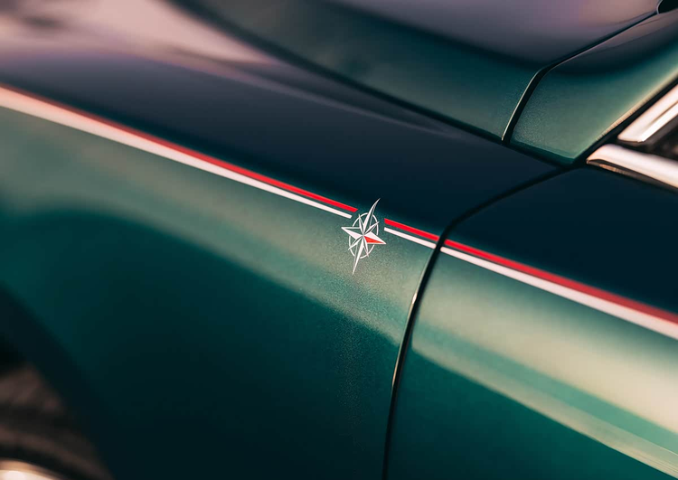 除了车漆,专属的标识是点睛之笔。在每辆车的前翼子板上,都手工绘制了一个精致的罗盘图案。图案上,对应车型名称的方位——东、西、南、北——会被特别以红色高亮标示,一目了然。一条凤凰红与北极白组成的双色腰线沿着车身划过,与22英寸的全抛光合金轮圈相搭配。轮圈的设计复刻了豪华游艇甲板的木质纹理质感,从细节处强化主题。