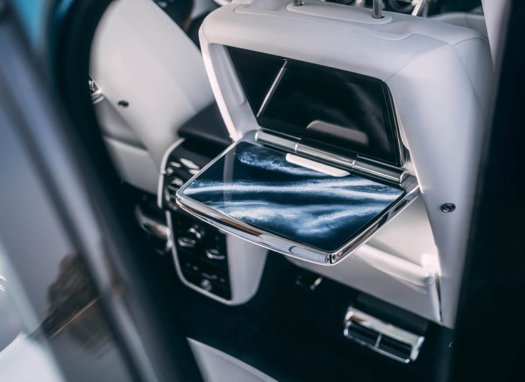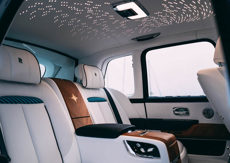 副驾驶前方的高光饰板以及后排中央折叠桌的桌面,都采用了手工彩绘。图案描绘的是快艇驶过后的尾流轨迹,并且其走向也与车型代表的方位相吻合。车内关键部位的装饰面板,采用了取自游艇甲板的同级柚木材质。而后排中央扶手箱盖板上,则镶嵌着一块由匠人手工拼接的罗盘图案木质饰板。抬头望去,著名的“星光顶”这次不再模拟夜空,而是以地中海地区的古典风海图为灵感,点缀出别样的航海浪漫。