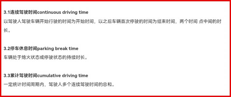 标准原文中关于停车休息的时间定义只有这么一条——车辆处于熄火状态或停驶状态的持续时长。看清楚,是熄火状态或停驶状态,这是一种二选一的关系。