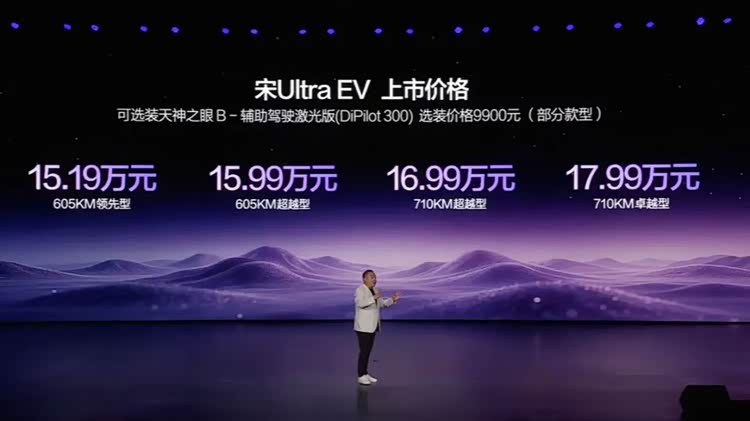2026年3月26日,比亚迪宋Ultra EV正式上市,共推出4款车型,售价区间为15.19-17.99万元。新车可选装天神之眼B-辅助驾驶激光版,支持城市领航辅助、全场景智能泊车辅助等功能,并将全系搭载比亚迪第二代刀片电池及闪充技术,CLTC最大续航里程为710km。
