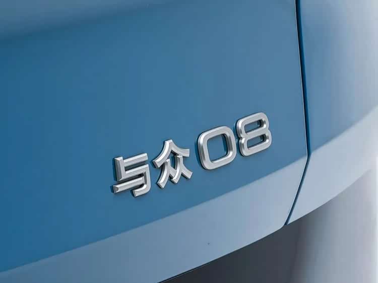 外观方面,与众08基本延续ID. EVO概念车的设计,前脸采用封闭式造型,狭长且上扬的大灯组,车头中央采用大众品牌标识,下包围设计有黑化装饰件,整体延续了大众安徽大胆、前卫、犀利的设计风格。车身侧面,其对A柱进行黑化处理,呈现出悬浮车顶的视觉效果,并配备有车顶行李架,采用密辐式轮圈造型,配合隐藏式车门把手,整体十分时尚。车尾部分,其采用狭长平直的尾灯组,相比车头要相对内敛,配备可发光的红色尾标,下侧为“ID.UNYX”金色标识,尾门右侧“与众08”标识表明身份信息。尺寸方面,与众08的长宽高分别为5000/1954/1672(1688)mm,轴距为3030mm,定位全尺寸SUV,采用五座布局。