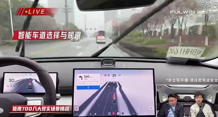 直播中最考验技术的,是复杂的人车混行路段。电动车贴边穿行、行人横穿马路、路边停靠车辆突然起步……这些让驾驶者神经紧绷的场景,猎鹰700处理得游刃有余。遇到路边行走的村民,系统提前减速、平稳礼让;电动车贴边穿行,自动保持安全距离;没标线的路段,也能贴着路中间走。这种细腻度,已经超越了简单的“功能实现”,更像是人与车之间的默契。