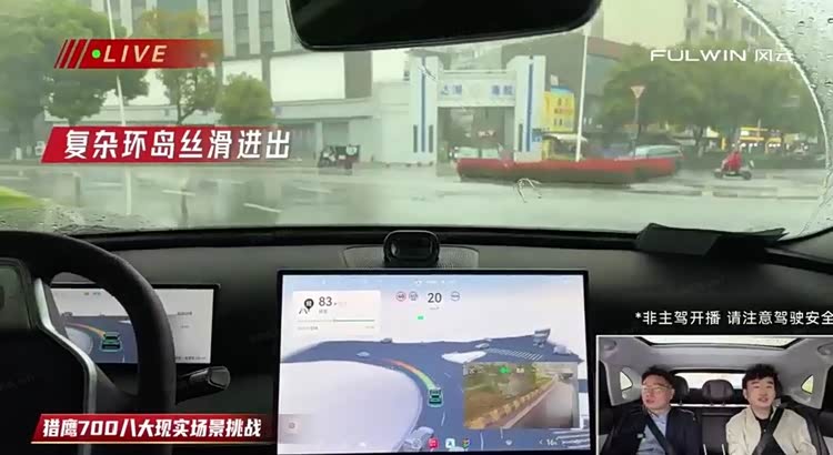 环岛是城市智驾的“试金石”。多股车流交汇,何时进、何时让,考验的是系统的博弈能力。直播中, 风云T9L(参数|询价)驶入环岛时,猎鹰700精准识别各个方向来车,找到合适的空档果断汇入,整个过程行云流水,没有急刹,没有犹豫。出环岛时,系统提前打灯、变道,一气呵成。