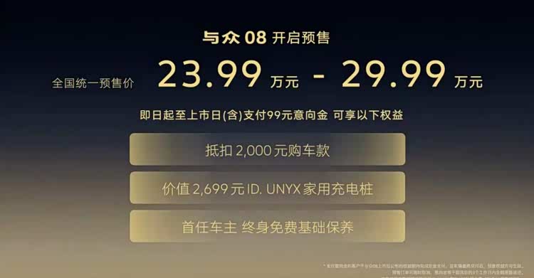 车家号·0浏览·2026-03-27 20:17 · 河北大众 与众08(参数|询价)最近开启了预售,预售价23.99-29.99万元。