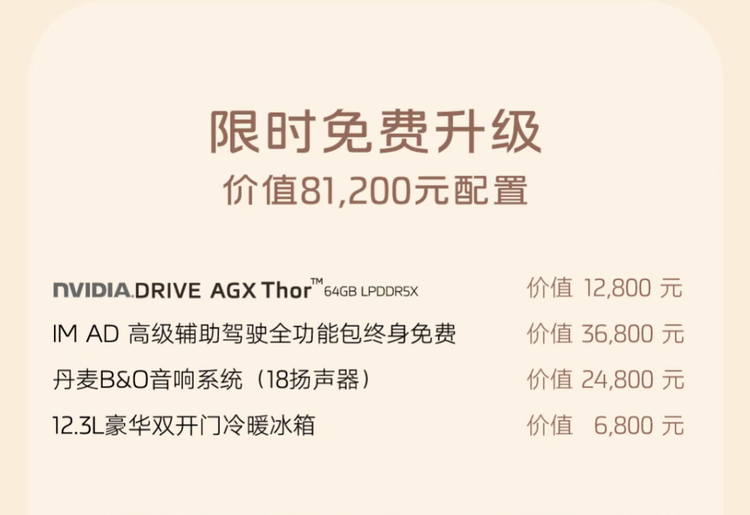 更绝的是,除四款高定艺术车漆及大象灰棕内饰限时免费选装、赠送电池终身质保外,64GB英伟达Thor芯片、IM AD辅助驾驶包、18扬声器B&O音响、12.3L双开冷暖冰箱等配置也全都免费送,总价值超过8万元。相当于通过预售政策,核心高阶配置直接做成全系标配。