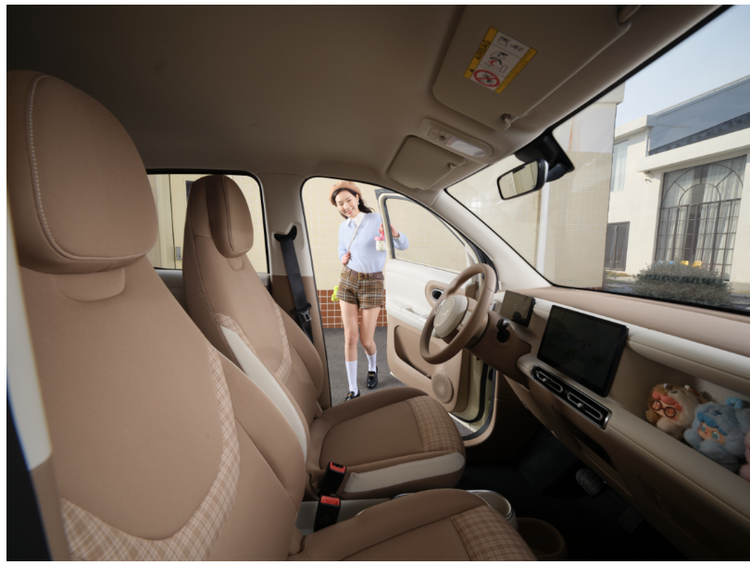 同样,这份高级感还持续到了车内。拉开车门,第五代宏光MINIEV的焦糖奶油内饰充满松弛感,而环行线条的修饰则让整个座舱更有“温度”。另外,新车还在副驾前方设计了“百变造景空间”,无论是储物还是用手办进行装饰都很合适。