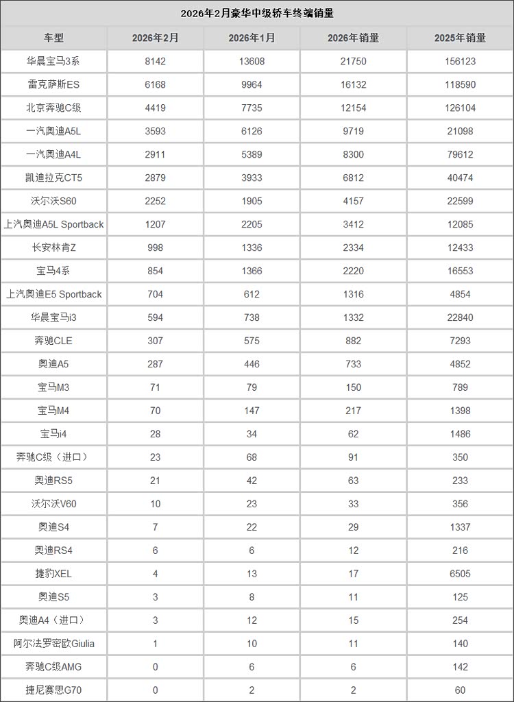 在2026年2月, 华晨宝马3系(参数|询价)成为月度销量领跑者,共售出8142辆,前2个月总销量21750辆。单纯就产品力而言,国产的3系Li是一辆可以满足消费者多方面需求的车型。进口宝马4系的表现同样不差,2月销量854辆,前2个月总销量2220辆;价格不是很高、外观设计很运动,这样的4系确实很招人喜欢。