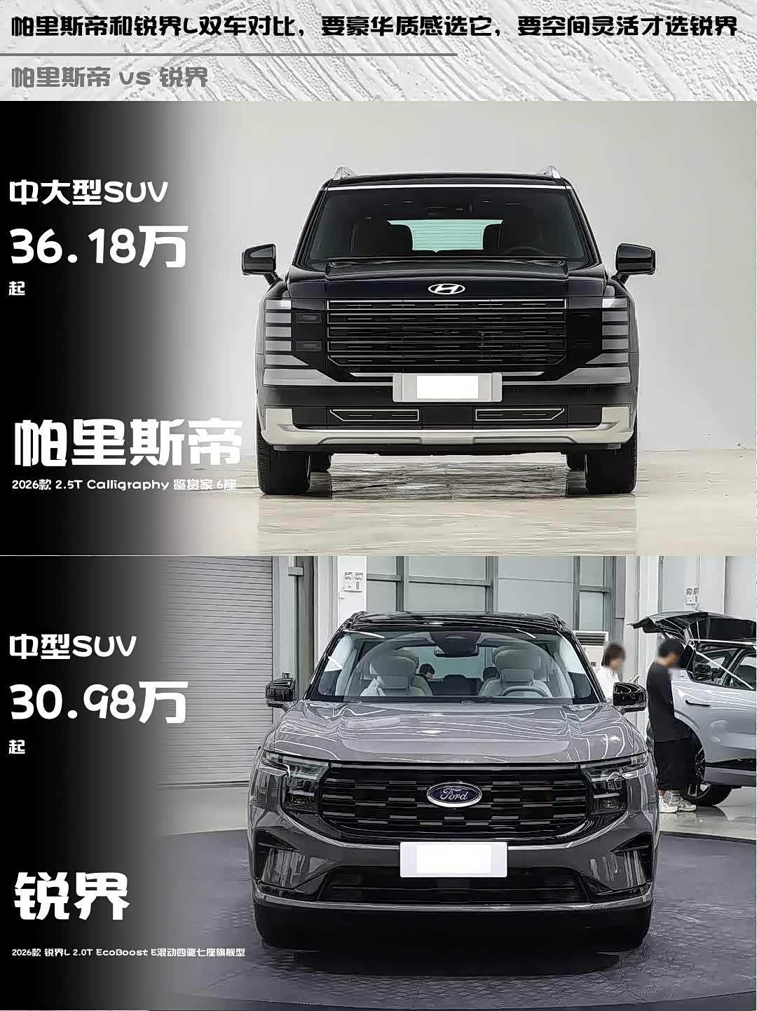 最近在选家用大六/七座SUV的朋友看过来! 帕里斯帝(参数|询价)2026款2.5T Calligraphy鉴赏家6座和锐界L 2026款混动四驱七座旗舰型这两台车,我深度对比后发现差异点太有意思了😏
