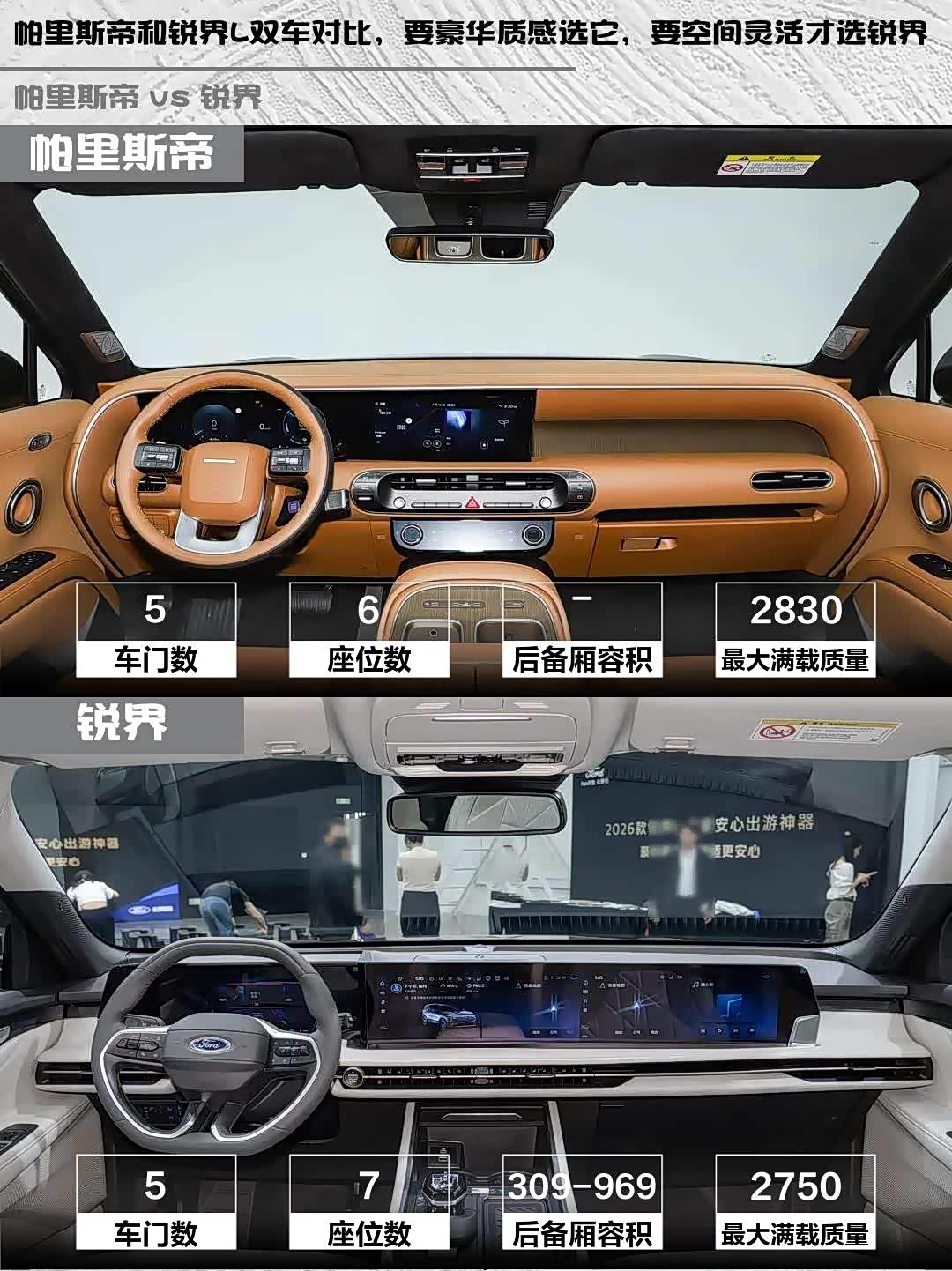 帕里斯帝的2+2+2六座设计,第二排两个独立座椅带通风/加热,重点是第三排坐垫高度和靠背角度都能调,我178cm坐进去膝盖离前排还有一拳。锐界L的2+2+3七座更灵活,中间200mm过道确实方便,但第三排坐垫偏薄,长途舒适性稍逊。不过后备箱锐界L三排放倒后969L容积比帕里斯帝能装(但帕里斯帝有电动感应尾门)
