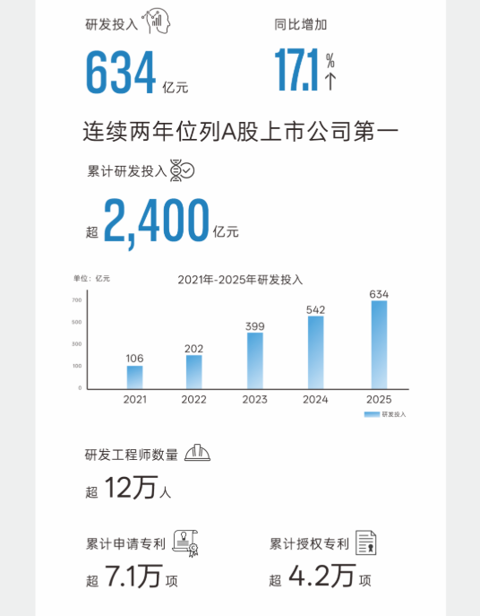 近两年来,比亚迪的研发投入连续位列A股上市公司第一,去年研发投入高达634亿元,同比增长17.1%。