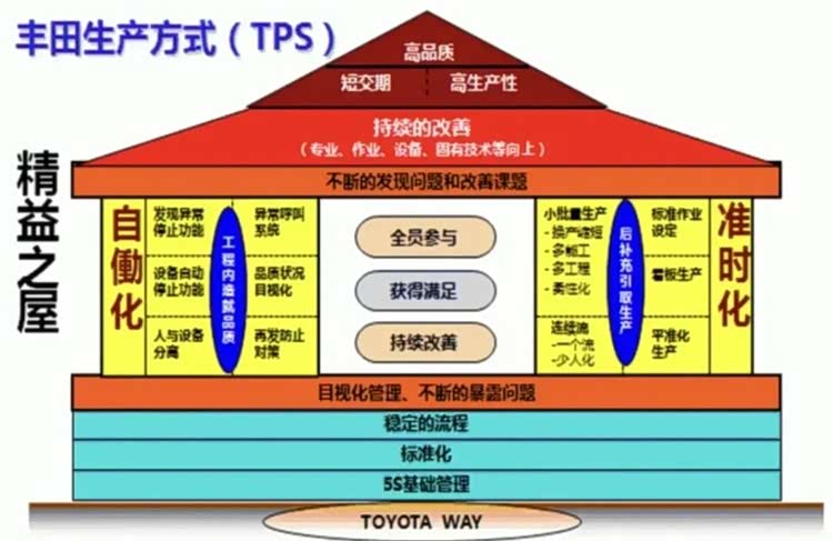 丰田发明了以“精益生产”为核心的丰田生产体系,即TPS。它有两大支柱:准时化和自动化。