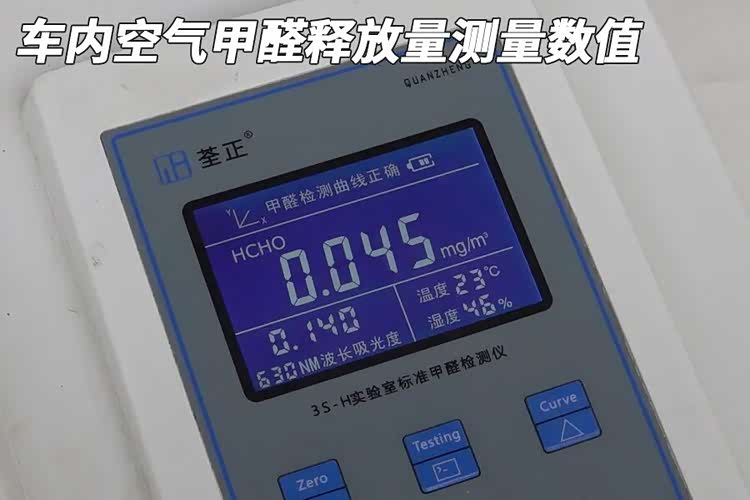 经过在23±1℃恒温环境中16小时的封闭,这辆车的车内空气甲醛释放量测量数值为0.045毫克每立方米。