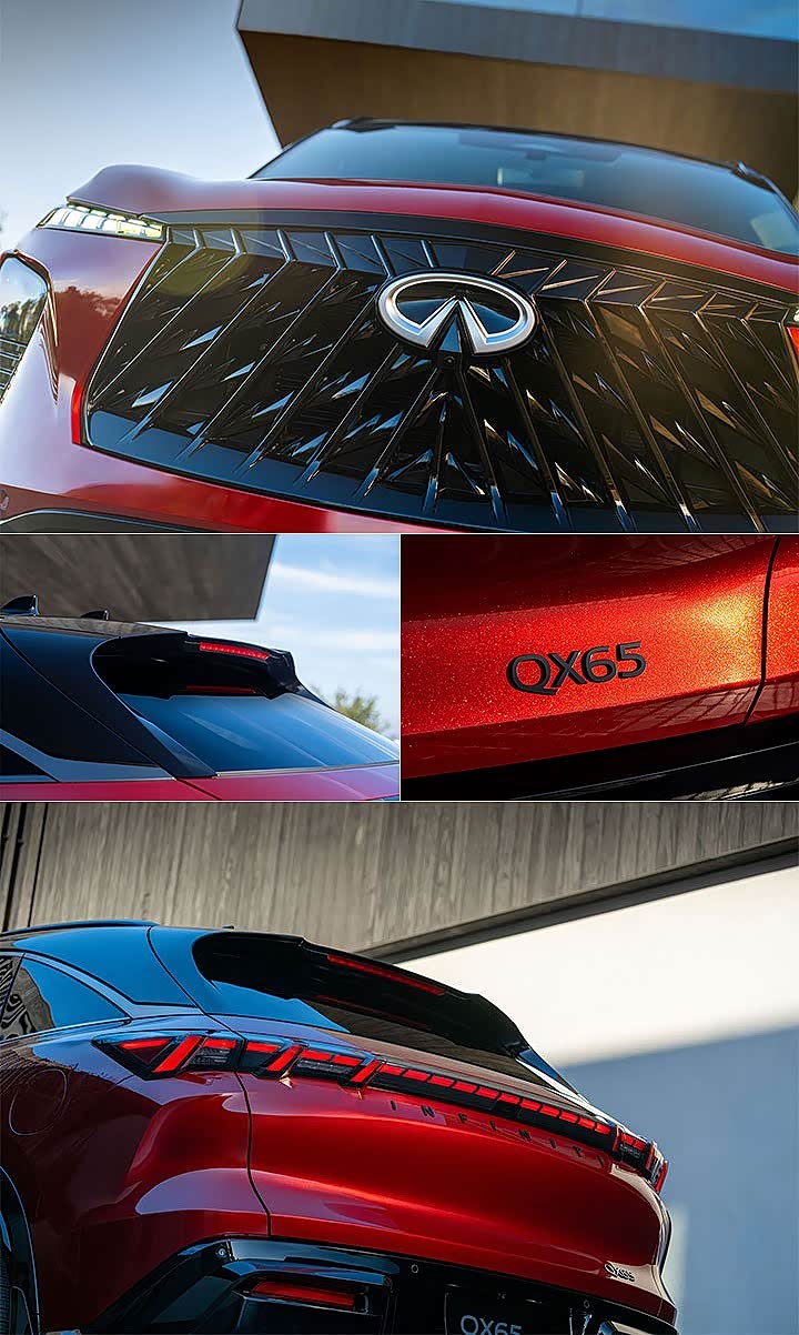 虽然从车系 QX65 名称来看,其与 QX60 之间乃是同级别、锁定不同市场喜好的作品,QX60 为 SUV 版本、QX65 则是导入更多运动元素的跨界版,不过在许多设计上却与国内现行版本大相迳庭,QX65 乃是英菲尼迪自 2021 年后,久违的品牌全新产品推出,同时也是英菲尼迪全新设计语汇呈现所在,包含头尾灯组样式,原场表示以日式竹林风貌为灵感所设计的水箱护罩等,都是当前英菲尼迪最新设计成果。