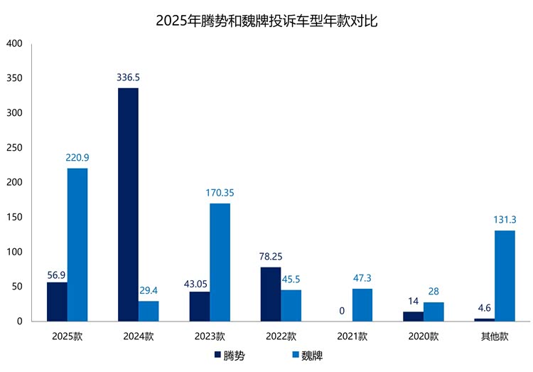 腾势投诉呈现单点爆发、集中度极高的特点,而魏牌则是多代车型共同贡献、分布更为分散的投诉格局,两者的年款投诉结构差异显著。