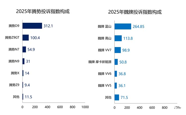 在销量层面,2025年腾势共卖出了157134辆,同比增长了24.7%;魏牌去年卖出了101954辆,同比增长了86.29%。而在投诉层面,2025年腾势的投诉指数为533.3,同比下滑了49%;魏牌的投诉指数为672.75,同比下滑了19%。