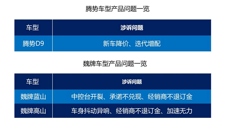 从涉诉车型的具体投诉问题来看,腾势D9与魏牌蓝山、高山呈现出明显不同的矛盾核心。其中,腾势D9的投诉集中在市场与产品策略层面,主要由新车定价波动、产品迭代节奏过快引发用户情绪不满,核心争议偏向消费预期与品牌沟通层面的问题。而魏牌蓝山、高山的投诉则聚焦产品质量与终端服务履约层面,既包含车辆本身的可靠性缺陷,也暴露出经销商管理、销售承诺兑现不足等体系性问题。