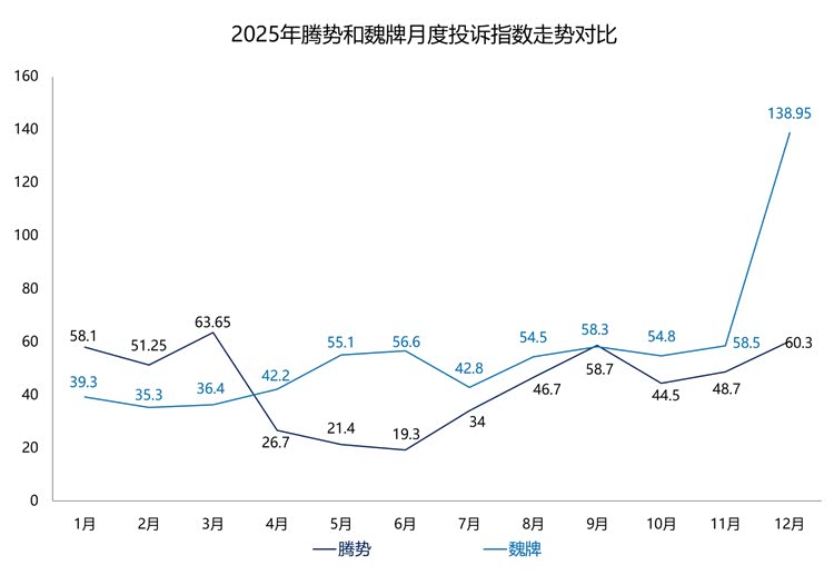 从月度走势来看,2025年腾势的单月投诉指数波动整体可控,尽管其在年末的投诉指数有所回升,但涨幅程度温和表现相对稳定。另一边,魏牌全年大部分时间投诉指数都不超过60,但2025年12月投诉指数突然攀升至138.95,进而抬高了魏牌的全年投诉指数。显而易见,魏牌在12月遭遇了集中投诉事件。