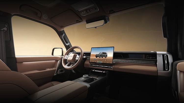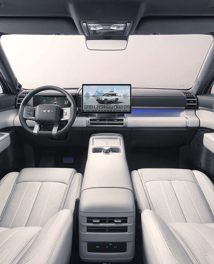 车身尺寸上,iCAR V27的长宽高分别为5055x1976x1894mm,轴距2910mm,四轮四角布局不仅强化了硬派气场,更带来了通透的车内空间,垂直空间最高达 1350mm,后排座椅放倒后可拓展出 1818 升平整储物空间,露营装备、大件家电均可轻松容纳,平衡家用与户外需求。