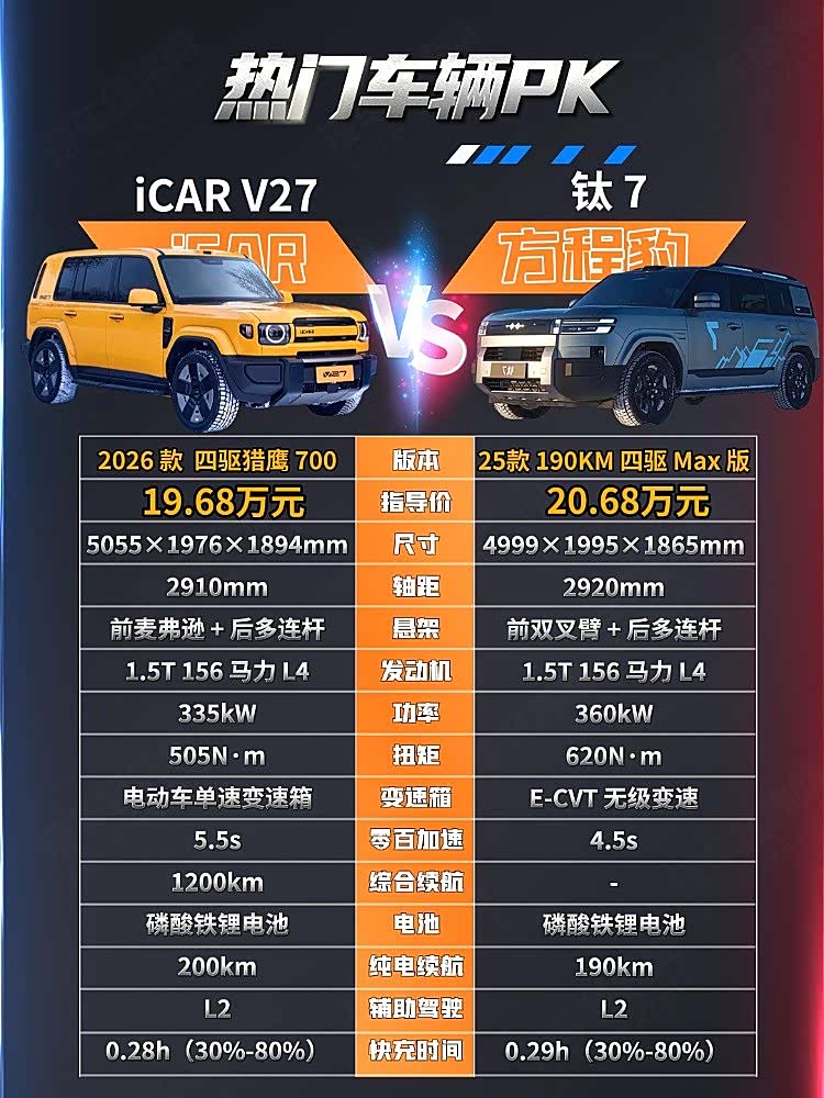 其中,iCAR V27 2026 款 200km 四驱猎鹰700版,官方指导价19.68万元,钛 7 PHEV 2025 款 190KM 四驱 Max 版,官方指导价 20.68 万元,两款车售价接近,那么哪款车更符合你的胃口呢?