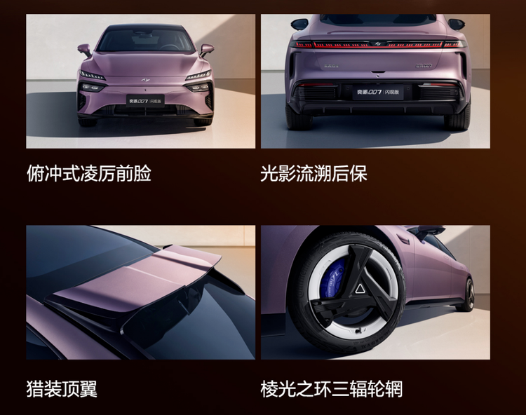 在外观方面,奕派007闪现版采用了俯冲式前脸设计,并增加了名为“电御紫”的车身配色。车身侧面呈现出低趴的猎装姿态,车尾配备扰流板。轮圈采用三辐式造型,搭配245mm宽胎。车身尺寸方面,该车长宽高分别为4890mm、1915mm、1476mm,轴距为2915mm。